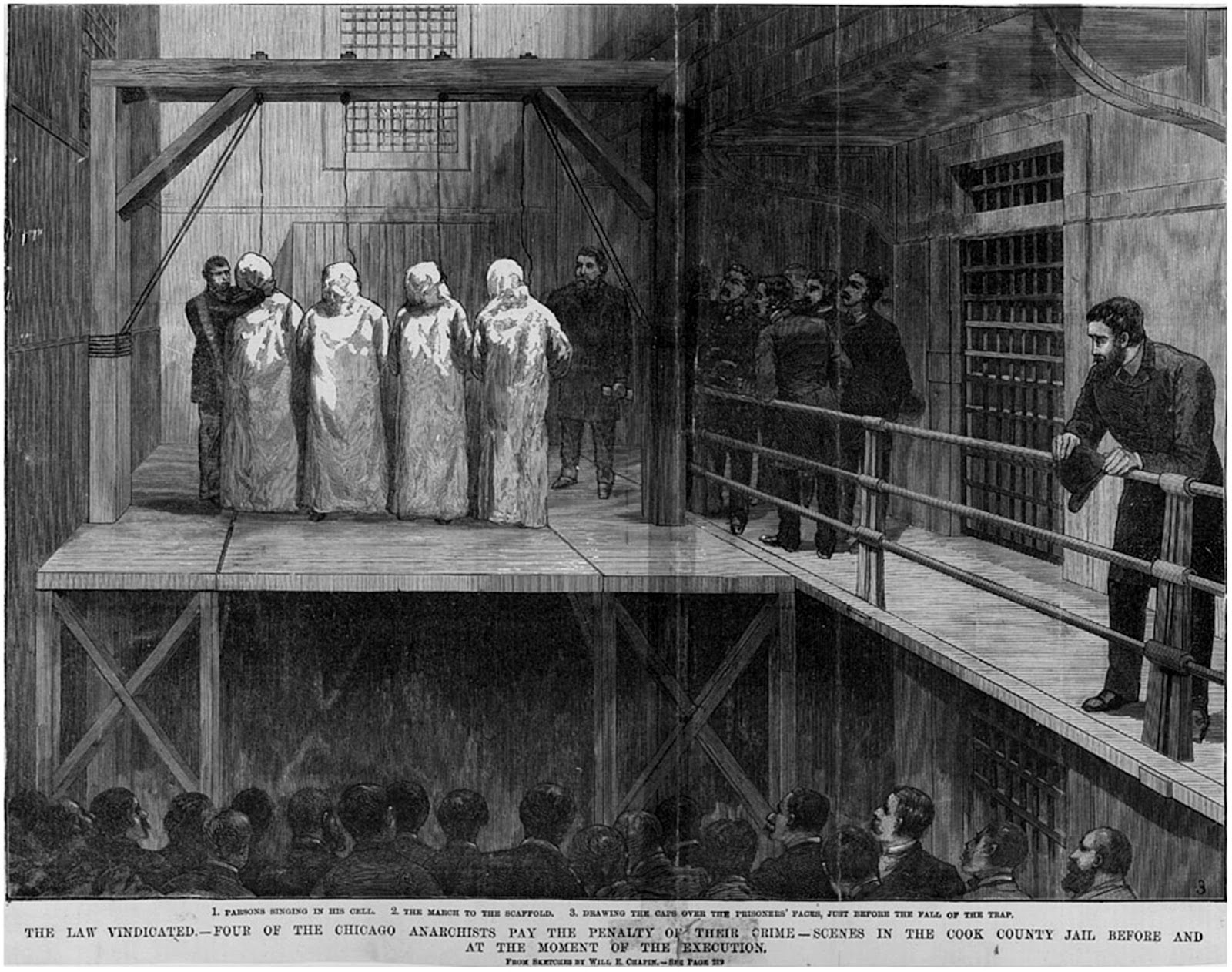 (…) Risas, tabacos, brandy, humo que ahoga en sus celdas a los reos despiertos. En el aire espeso y húmedo chisporrotean, cocean, bloquean, las luces eléctricas. Inmóvil sobre la baranda de las celdas, mira al cadalso un gato… ¡cuando de pronto una melodiosa voz, llena de fuerza y sentido, la voz de uno, de estos hombres a quienes se supone fieras humanas, trémula primero, vibrante enseguida, pura luego y serena, como quien ya se siente libre de polvo y ataduras, resonó en la celda de Engel, que, arrebatado por el éxtasis, recitaba “El Tejedor” de Henry Keine, como ofreciendo al cielo el espíritu, con los dos brazos en alto:
