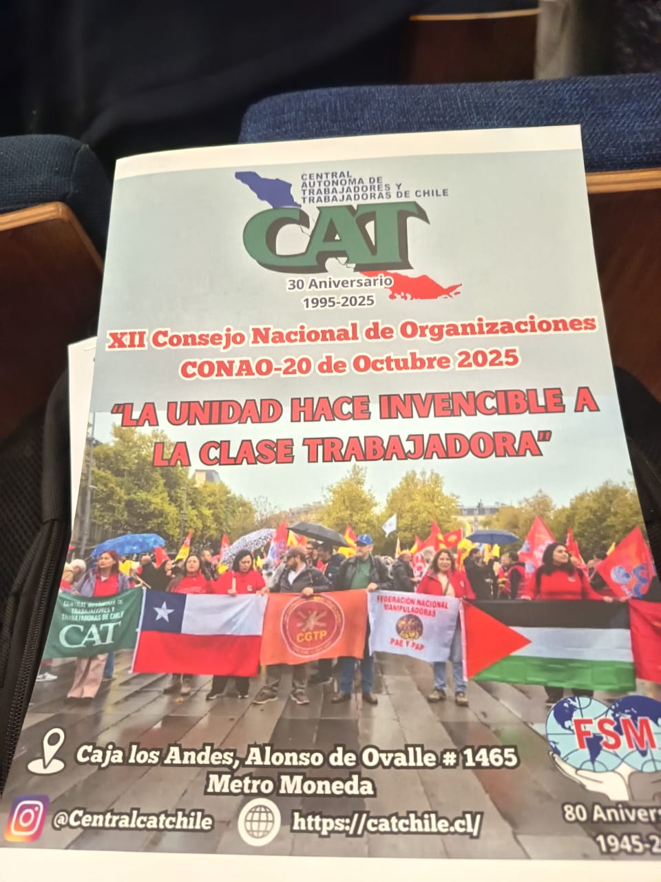 Este lunes 20 de octubre se realizó el encuentro nacional de organizaciones afiliadas a la Central Autónoma de Trabajadores y Trabajadoras (CAT) para celebrar los 30 años de la CAT y los 80 años de la Federación Sindical Mundial (FSM)