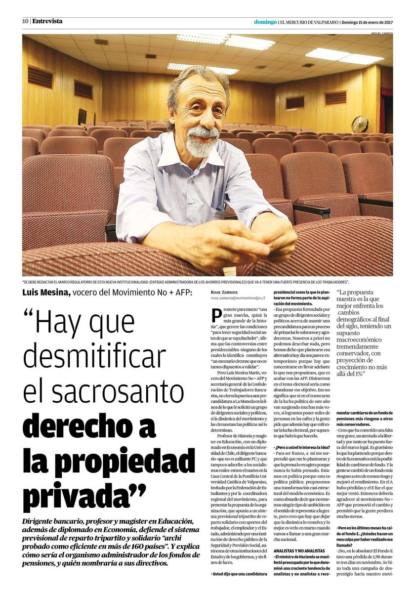 Pero Luis Mesina Marín, vocero del Movimiento No + AFP y secretario general de la Confederación de Trabajadores Bancarios, no cierra la puerta a una pre-candidatura La Moneda en la línea de lo que le solicitó un grupo de dirigentes sociales y políticos, si la dinámica del movimiento y las circunstancias políticas así lo determinan.Profesor de Historia y magister en Educación, con un diplomado en Economía en la Universidad de Chila, el dirigente bancario, que no es militante PC y que tampoco adscribe a los socialismos reales, estuvo el martes en la Casa Central de la Pontificia Universidad Católica de Valparaíso,  invitado por la Federación de Estudiantes y por la coordinadora regional del movimiento,  para presentar la prepuesta de la organización, que apunta a un sistema previsional  tripartito de reparto solidario con aportes del trabajador, el empleador y el Estado, administrado por una institución de derecho público de la Seguridad y Previsión Social, autónoma de otras instituciones del Estado y de los gobiernos, y sin fines de lucro.-Usted dijo que una candidatura presidencial como la que le plantearon no forma parte de la aspiración del movimiento.- Esa propuesta formulada por un grupo de dirigentes sociales y políticos acerca de asumir una pre candidatura para un proceso de primarias lo valoramos, y agradecemos. Nosotros a priori no podemos desechar nada, pero hemos dicho que plantearse esa alternativa hoy nos parece extemporáneo porque hay que concentrarse en llevar adelante lo que nos propusimos, que es acabar con las AFP.  Distraernos en el tema electoral sería como abandonar ese objetivo. Eso no significa que si en el transcurso de la lucha política de este año van surgiendo muchas más voces, si logramos poner miles de personas en las calles y la gente pide que además hay que enfrentar la lucha electoral, por supuesto que habla que hacerlo.-  ¿Pero a usted le interesa la idea?- Para ser franco, a mí me sorprendió que me lo plantearan y duela prensa lo acogiera porque nunca lo había pensado. Estamos en política porque esto es política pública: proponemos una transformación casi estructural del modelo económico.  Es como absurdo decir que no tenemos  ningún tipo de ambición en el sentido de representar a  la gente, pero creo que hay que dejar que la dinámica lo resuelva y lo mejor es verlo en marzo cuando vamos a llamar a una gran marcha nacional.ANALISTAS Y NO ANALISTAS