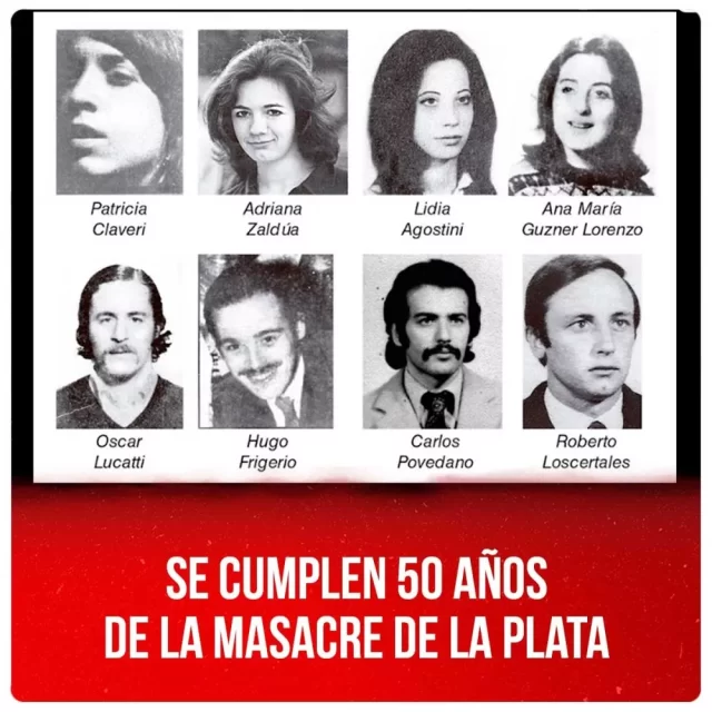 “Los compañeros, con sus debilidades y grandezas, sólo se pueden apreciar a la luz de la ideología y la tarea por las cuales ellos dieron su vida: el trotskismo y la construcción del Partido Mundial de la Revolución Socialista. […] Comprendemos que muchos de los familiares y compañeros busquen una reparación. Pero, ¿quién es el que tiene que reparar y cómo lograrlo? […] En primer lugar, el gobierno peronista, que en su momento toleró y encubrió su accionar, y que ahora, pese a su llamado al dialoguismo, no está haciendo nada que signifique parar a las bandas fascistas. También son responsables aquellos sectores que desde la oposición al lopezrreguismo y en nombre de la defensa de la democracia se han negado a movilizar contra el fascismo, haciéndole el juego a un nuevo golpismo militar que, por ahora, se escuda tras la fachada de mantener las instituciones. Detrás de estos sectores están los grandes patrones, industriales, latifundistas y agentes de los monopolios, nacionales y extranjeros. […] Si nuevamente afrontamos el peligro de que las libertades democráticas sean liquidadas por un golpe militar, debemos señalar que esto en parte se debe a que en las filas del movimiento obrero y del pueblo hay dos sectores que les hacen el juego. El primero es la burocracia sindical, que luego de la caída de López Rega y Rodrigo negoció la lucha del movimiento obrero para apoyar a un gobierno que explota a los trabajadores y que engendró en su seno las bandas fascistas. Esa burocracia no moviliza contra el nuevo plan económico ni contra los crímenes de la ultraderecha. Por ello tenemos que marcar su responsabilidad en la masacre de La Plata. El segundo responsable son las organizaciones guerrilleras. Cuando la clase obrera se lanzó a la movilización para parar el intento fascista de López Rega, quedó claro que era ella y sólo ella capaz de frenar al fascismo. En diez días de lucha hizo más que todas las aventuras terroristas juntas durante años. […] Como siempre, aún en esta hora de dolor e indignación, seguiremos fieles al movimiento obrero, luchando contra las direcciones sindicales que lo frenan y lo atan a los planes de la patronal, y contra la guerrilla elitista que lo confunde y contribuye a provocar su desmovilización. No buscaremos nosotros nuestra venganza ni por el camino de la conciliación ni por el de la guerrilla. Seguiremos confiando en la movilización de los trabajadores a pesar de que hoy no acierte a responder de conjunto a la ofensiva de la reacción. […] Este es nuestro compromiso aquí, en la despedida de nuestros queridos compañeros, ante sus familiares y camaradas de lucha cotidiana. Su muerte tremenda no ha sido en vano porque tenían razón; ellos sabían que estaban en el camino justo, en el único posible. Nosotros les decimos que vamos a continuar por ese camino; que aunque tampoco algunos de nosotros veamos el final, estamos firme, total y absolutamente convencidos de esa victoria de la clase obrera que, al terminar con todo los explotadores y asesinos, brindará la mejor y única reparación posible. Laucha, Hugo, Dicki, Adrianita, Patricia, Lidia, Ana María, Oscar: ¡Hasta el socialismo siempre!”.(iv) Hoy, a cincuenta años de la Masacre de La Plata, continuamos firmes en el camino del socialismo revolucionario.