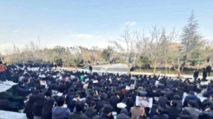 Foto y texto de @anjmotahed en X. «31 de enero. Concentración y sentada de estudiantes de la Universidad de Mashhad en conmemoración del difunto Parsa Saffar. Durante este evento, los estudiantes exigieron la liberación de Amin Pourfarhang».