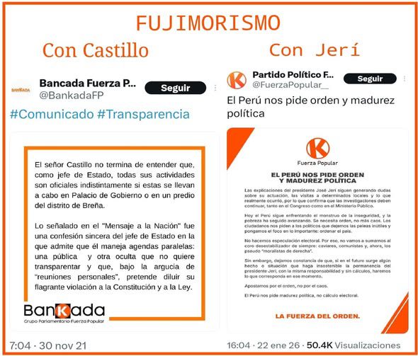 Sin embargo, una vez lograda la vacancia, pasaron del ataque al 𝗯𝗹𝗶𝗻𝗱𝗮𝗷𝗲 𝘁𝗼𝘁𝗮𝗹 para sostener a sus títeres actuales. Es indignante comparar su agresividad del 2021 con la 𝗺𝗼𝗱𝗲𝗿𝗮𝗰𝗶𝗼́𝗻 𝘆 𝘀𝗶𝗹𝗲𝗻𝗰𝗶𝗼 que muestran hoy frente a los escándalos en Palacio.