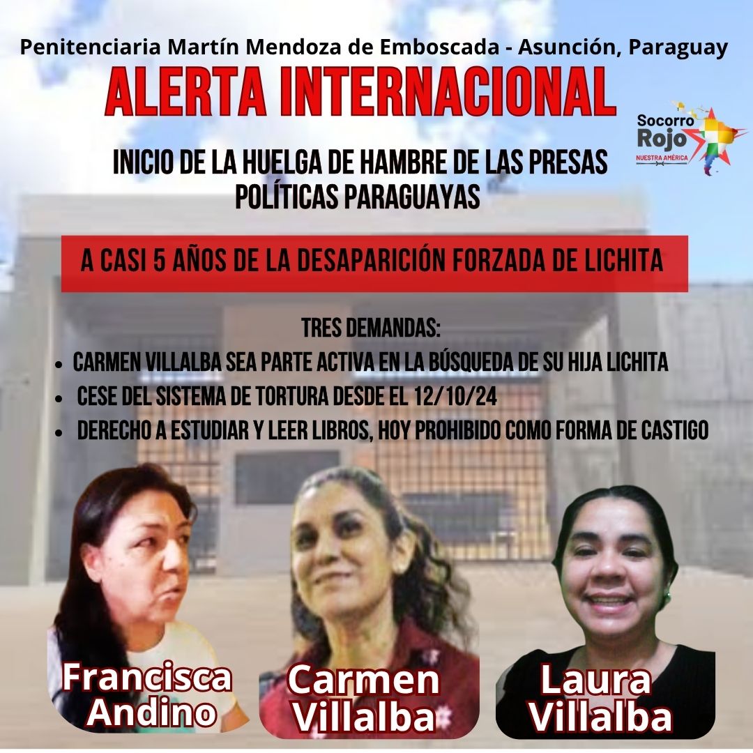 Desde *Socorro Rojo Nuestra América* llamamos a las organizaciones sociales y de DDHH a estar en estado de alerta por la salud de las compañeras y responsabilizamos al Estado Paraguayo por la integridad física de Carmen y Laura Villalba y Francisca Andino.