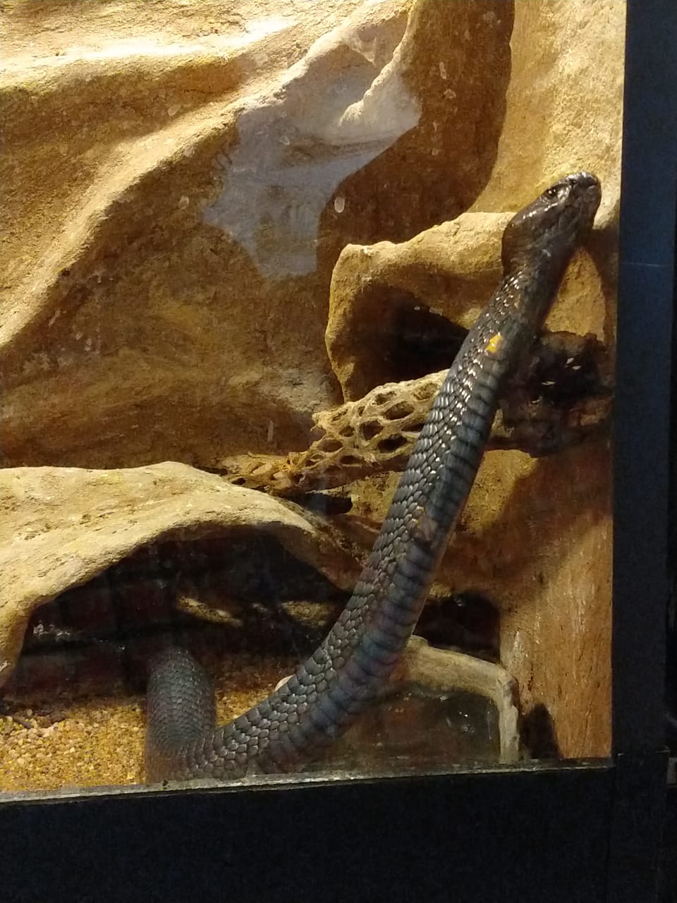 Lo primero que se nos mostró, fue la sala en donde hay víboras, alacranes, arañas y una tortuga de desierto. Como los lugares en donde tienen a esos reptiles son calientes, se procura emular ese medio ambiente mediante focos que están dentro de las cajas de vidrio en donde están las víboras. El chico, Pedro, nos explicó que para distinguir las víboras venenosas de las que no lo son, deben tenerse en cuenta las figuras y trazos de sus pieles. En el caso de las venenosas, además de que su cabeza es más triangular – por las glándulas que contienen el veneno –, sus colores son más vistosos y las figuras son muy regulares, como las coralillo, de vibrantes colores rojos o amarillos, además de que sus, digamos, adornos son, en efecto, muy parejos.